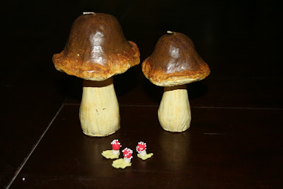 Fede paddehatte, som faktisk er stearinlys, men ild i toppen bliver uden min tilladelse, før efter jul. De bitte bitte små, er sukkerpynt til mine julemuffins. Ej hvor de er fine. Dem skal i nok få billede af, når der bliver bagt og en opskrift nok også. Jeg må købe mig til svampene, da jeg ikke er bare kvart så fantasifuld som hende her. Hun tænker bare noget og lidt efter har hun gang i noget kreativt.